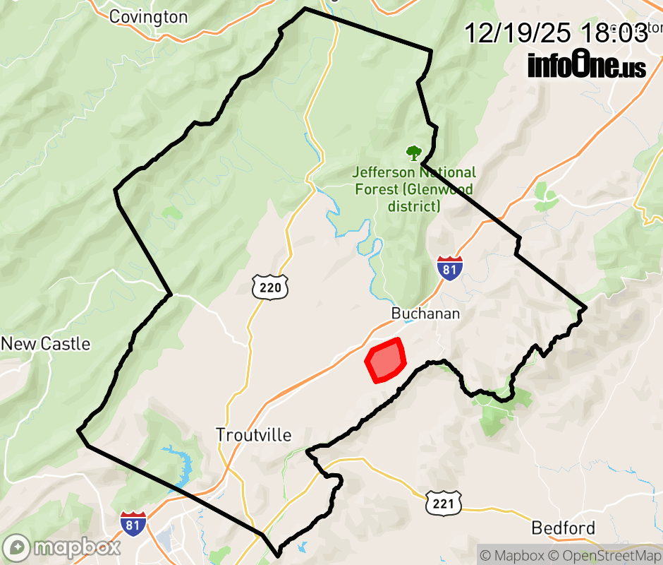 Canceled 12/19/25 6:43 PM Botetourt County has 1 power outage affecting 106 customers. Appalachian Power 106 without power Buchanan: Customers affected: 106 (10%) Estimated repair: Fri 6:30 PM Updated: Fri 12/19/25 6:03 PM EST ![]() Updated: Fri 12/19/25 6:03 PM EST |