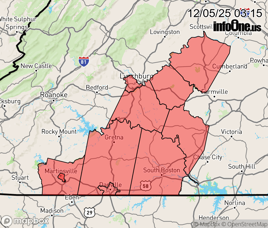 Canceled 12/5/25 10:00 AM Winter Weather Advisory issued December 5 at 3:13AM EST until December 5 at 1:00PM EST by NWS Blacksburg VA Low pressure over the area is expected to move east and away from the area this afternoon. Wintry precipitation is expected to come to an end before 1PM today. * WHAT... Snow expected. Total snow accumulations between 2 and 4 inches. * WHERE... Portions of central and south central Virginia. * WHEN... Until 1 PM EST this afternoon. * IMPACTS... Untreated roads, and especially bridges and overpasses, will likely be slick and hazardous. Plan on slippery road conditions. The hazardous conditions will impact this mornings commute. ![]() |