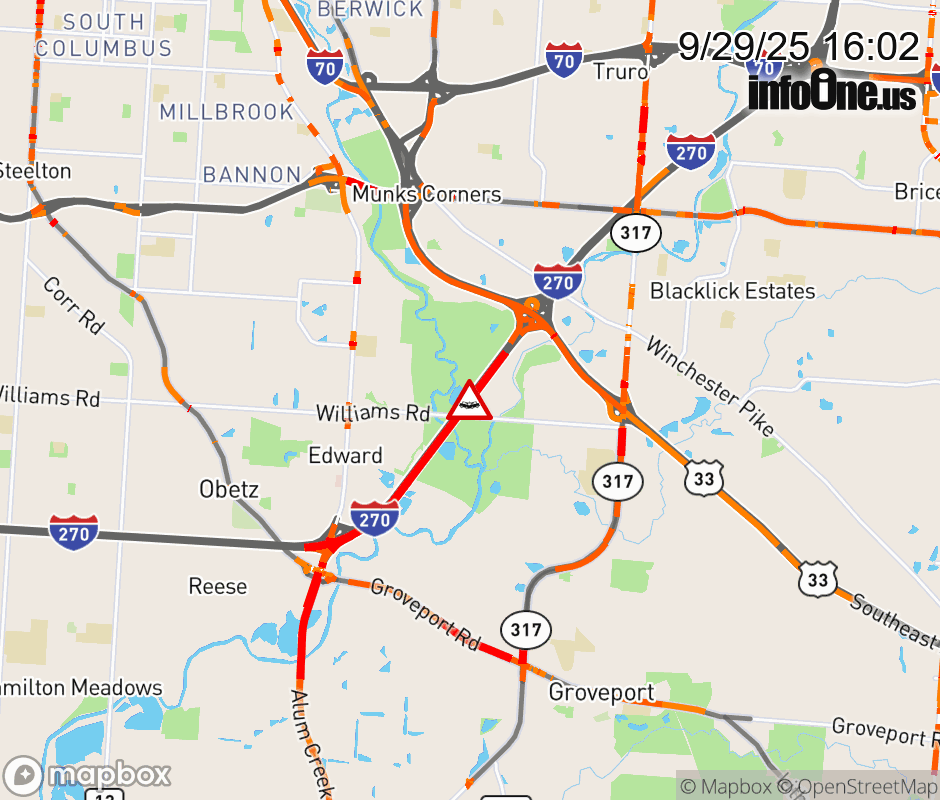 The right shoulder is blocked on I-270 North beyond Alum Creek Dr, due to a crash. Updated: Mon 9/29/25 4:02 PM EDT ![]() Updated: Mon 9/29/25 4:02 PM EDT |