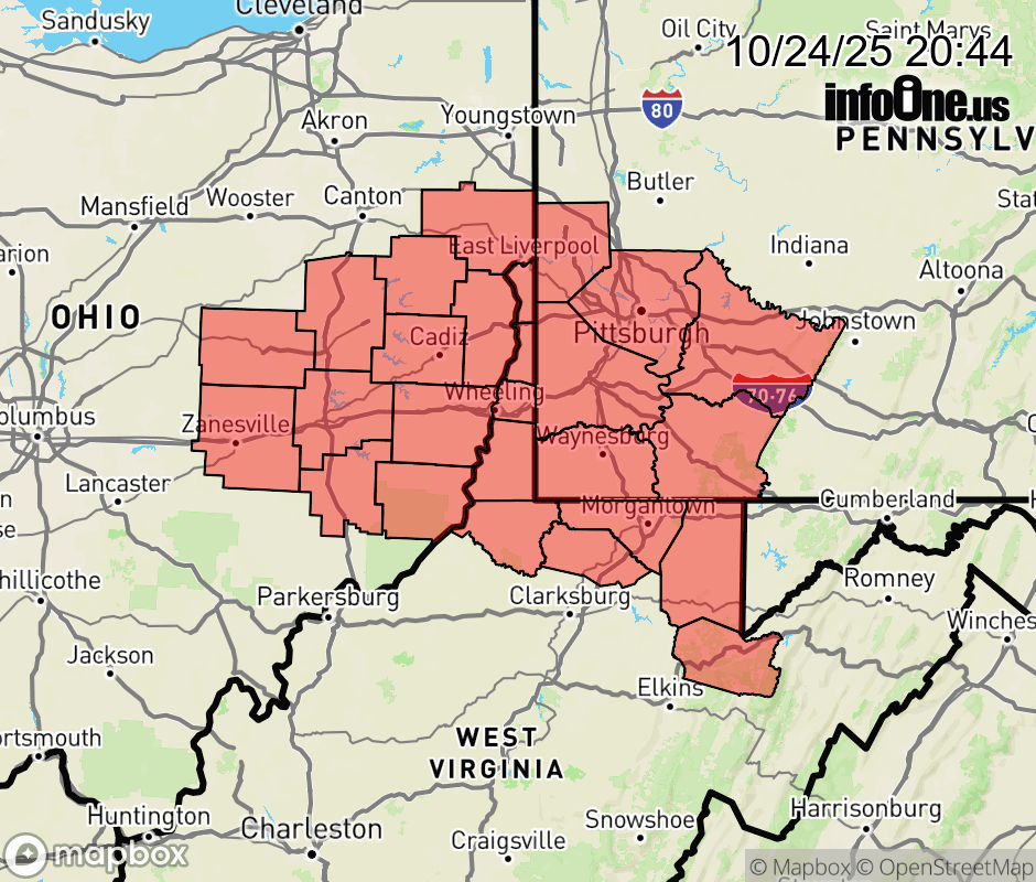 Canceled 10/25/25 3:32 AM Freeze Warning issued October 24 at 8:42PM EDT until October 25 at 9:00AM EDT by NWS Pittsburgh PA * WHAT... Sub-freezing temperatures as low as 26 expected. * WHERE... Portions of east central Ohio, southwest and western Pennsylvania, and northern and the northern panhandle of West Virginia. * WHEN... From midnight tonight to 9 AM EDT Saturday. * IMPACTS... Frost and freeze conditions could kill crops, other sensitive vegetation and possibly damage unprotected outdoor plumbing. ![]() |