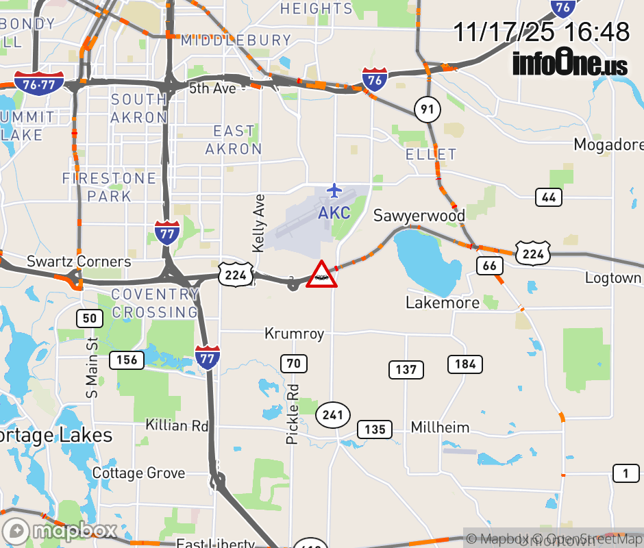 The 2 left lanes are blocked on US-224 East at E Waterloo Rd the left lane is blocked on US-224 West at E Waterloo Rd, due to a crash. The 2 left lanes are blocked on US-224 East at E Waterloo Rd the left lane is blocked on US-224 West at E Waterloo Rd, due to a crash. ![]() |