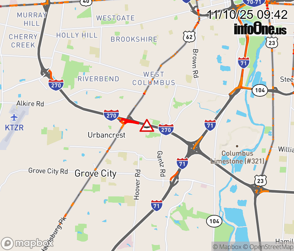 The right lane is blocked on I-270 East beyond US-62/SR-3, due to a crash. Updated: Mon 11/10/25 9:42 AM EST ![]() Updated: Mon 11/10/25 9:42 AM EST |