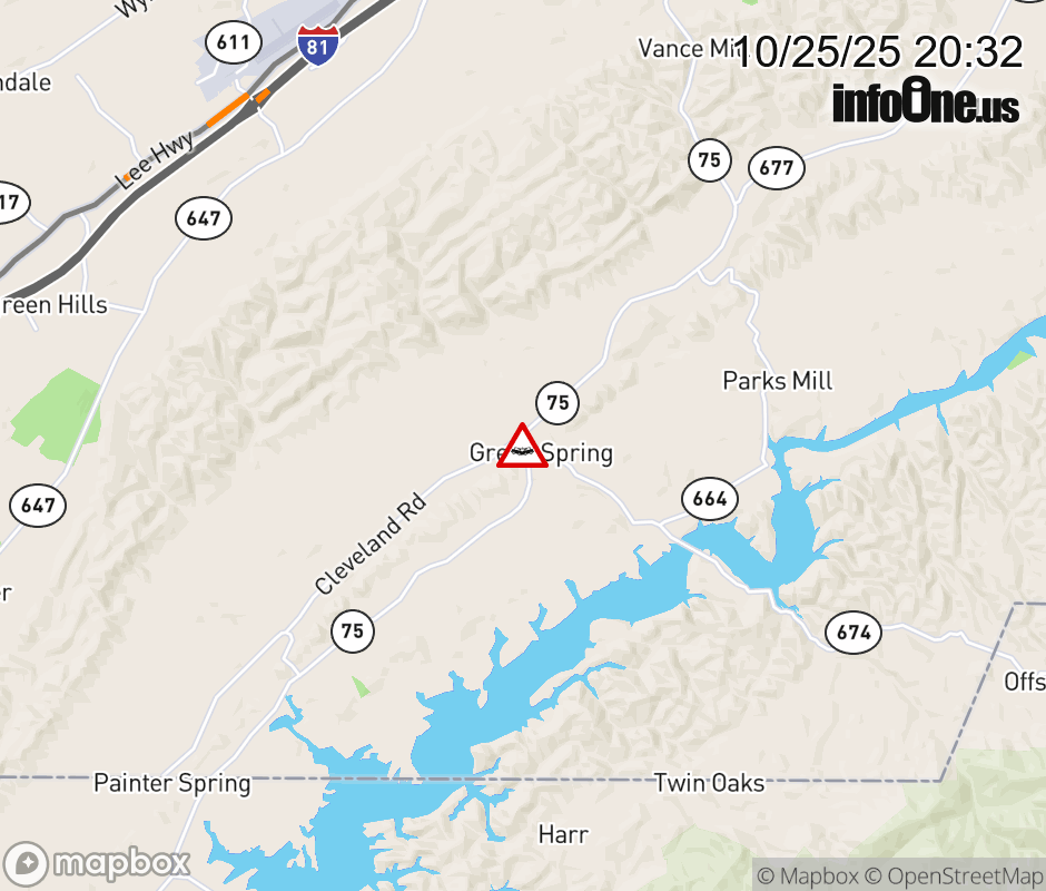 On VA-75 in the County of Washington, in the vicinity of Cleveland Rd; Green Springs Church Rd; Rt. 911N/S (Washington County); Rt. 670E/W (Washington County), motorists can expect delays due to a vehicle crash. All north lanes are closed. All south lanes are closed. Updated: Sat 10/25/25 8:32 PM EDT ![]() Updated: Sat 10/25/25 8:32 PM EDT |