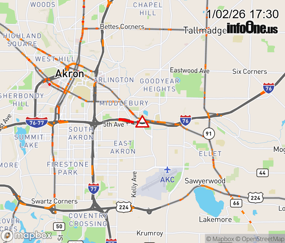 The 2 left lanes are closed on I-76 West at SR-241/Innovation Way/Kelly Ave, due to a crash. Updated: Fri 1/2/26 5:30 PM EST ![]() Updated: Fri 1/2/26 5:30 PM EST |