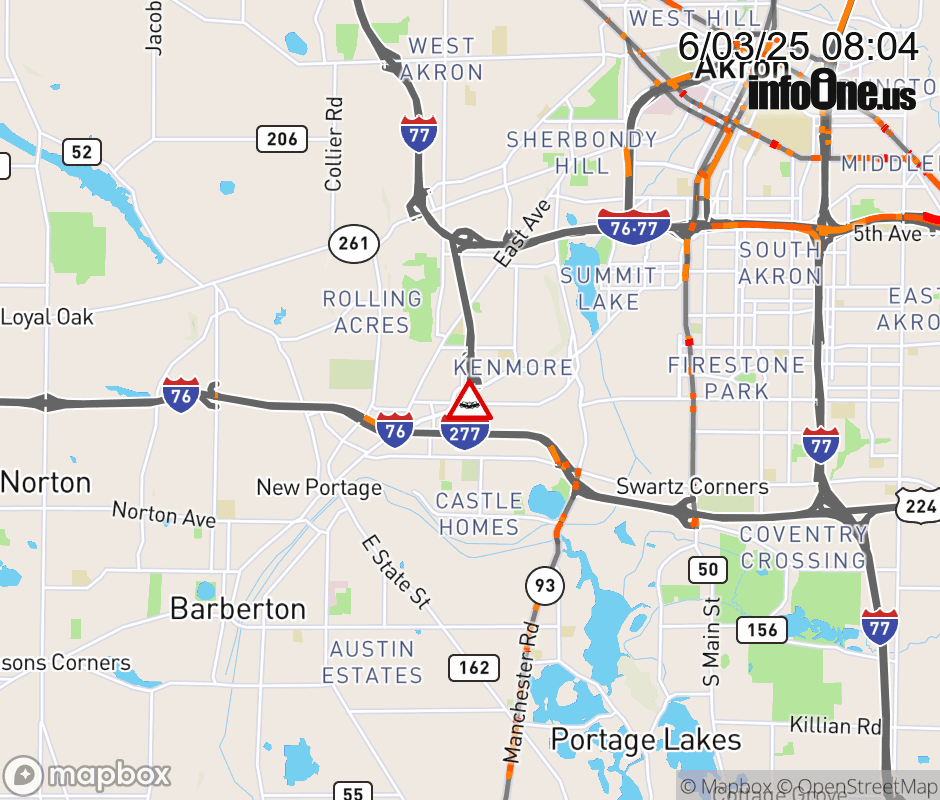 The 2 right lanes are blocked on I-76 East at East I-277/US-224E to I76E-1, due to a crash. Updated: Tue 6/3/25 8:04 AM EDT ![]() Updated: Tue 6/3/25 8:04 AM EDT |