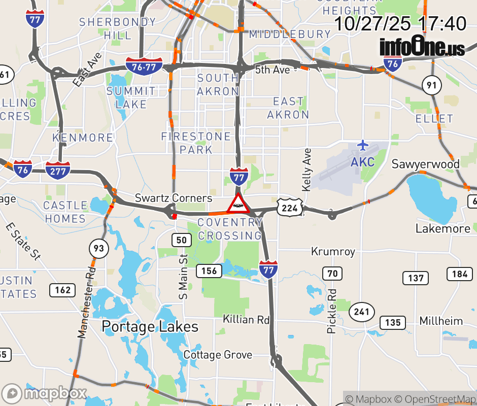 The right lane is closed on Ramp I-77 South to I-277/US-224 West, due to a crash. Updated: Mon 10/27/25 5:40 PM EDT ![]() Updated: Mon 10/27/25 5:40 PM EDT |