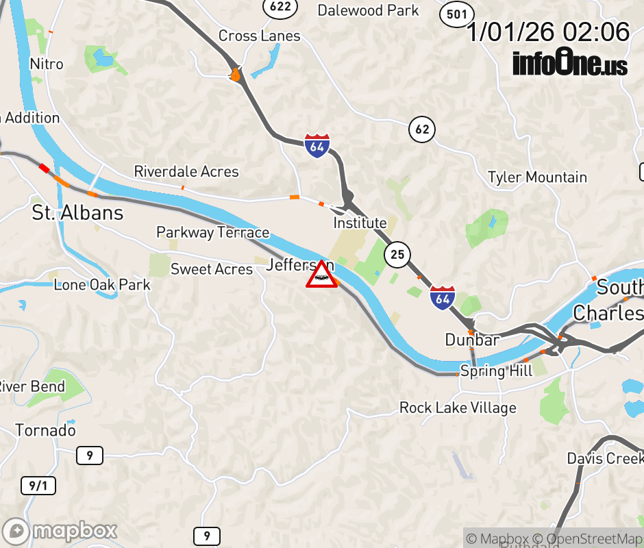 Vehicle Crash on US-60W (6580 MacCorkle Ave SW, Jefferson). The westbound right lane is closed. Updated: Thu 1/1/26 2:06 AM EST ![]() Updated: Thu 1/1/26 2:06 AM EST |