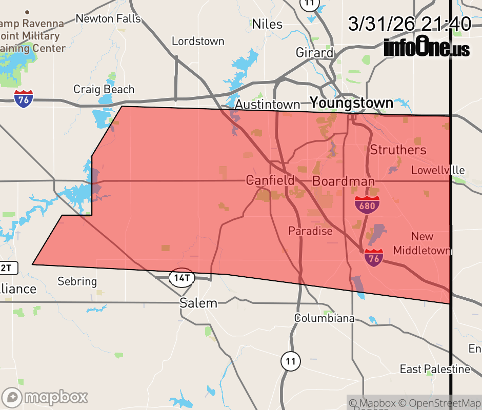 Canceled 3/31/26 9:51 PM Severe Thunderstorm Warning issued March 31 at 9:39PM EDT until March 31 at 10:15PM EDT by NWS Cleveland OH SVRCLE The National Weather Service in Cleveland has issued a * Severe Thunderstorm Warning for... Mahoning County in northeastern Ohio... * Until 1015 PM EDT. * At 939 PM EDT, a severe thunderstorm was located 7 miles northeast of Sebring, or 8 miles northwest of Salem, moving east at 50 mph. HAZARD...60 mph wind gusts and penny size hail. SOURCE...Radar indicated. IMPACT...Expect damage to trees and power lines. * Locations impacted include... Youngstown, Boardman, Campbell, Canfield, Sebring, Austintown, Struthers, Poland, Ellsworth, New Middletown, Lowellville, Berlin Center, and Greenford. ![]() |