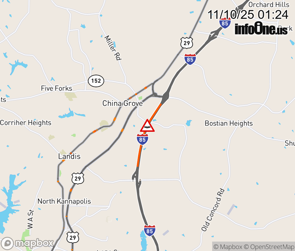 The right lane is closed past Exit 68 (NC 152). Updated: Mon 11/10/25 1:24 AM EST ![]() Updated: Mon 11/10/25 1:24 AM EST |