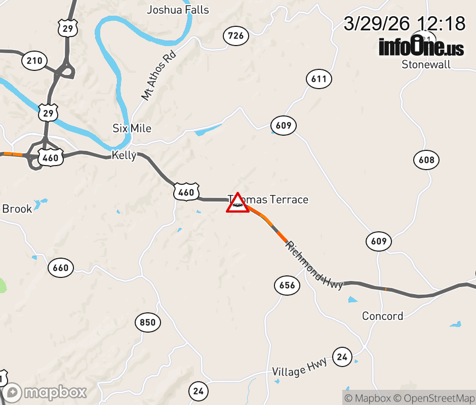 On US-460 in the County of Campbell, in the vicinity of Mt Olivet Church Rd; Stormy Hill Rd, motorists can expect delays due to a vehicle crash. The west left shoulder and left lane are closed. Updated: Sun 3/29/26 12:18 PM EDT ![]() Updated: Sun 3/29/26 12:18 PM EDT |