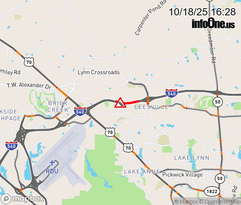 There are intermittent right lane closures from Exit 17 (Triangle Town Blvd) to Exit 3 (Lumley Rd), due to a brush fire. Updated: Sat 10/18/25 4:28 PM EDT ![]() Updated: Sat 10/18/25 4:28 PM EDT |