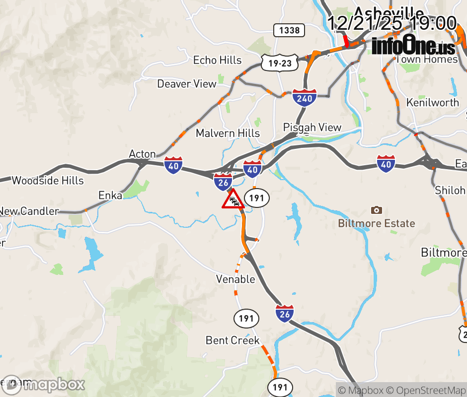 The two left lanes are closed 1.5 miles prior to Exit 33, NC 191 (Brevard Road). Updated: Sun 12/21/25 7:00 PM EST ![]() Updated: Sun 12/21/25 7:00 PM EST |