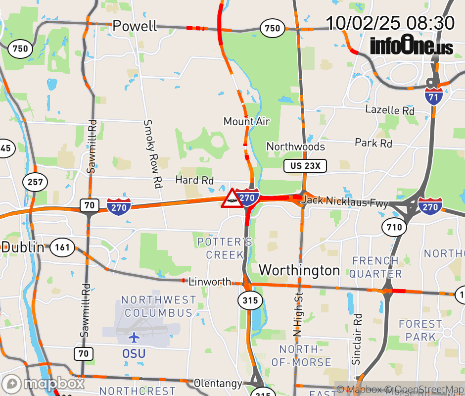 The 2 left lanes are blocked on I-270 West beyond SR-315 South, due to a crash. Updated: Thu 10/2/25 8:30 AM EDT ![]() Updated: Thu 10/2/25 8:30 AM EDT |