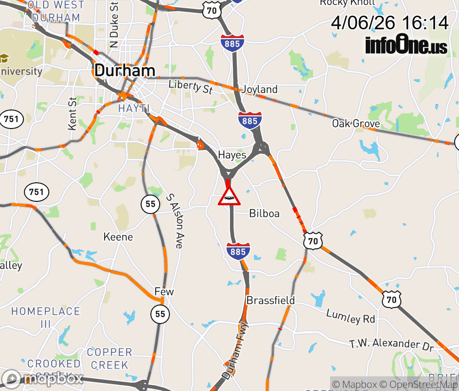 The left lane is closed after Exit 9 (NC 147). Updated: Mon 4/6/26 4:14 PM EDT ![]() Updated: Mon 4/6/26 4:14 PM EDT |
