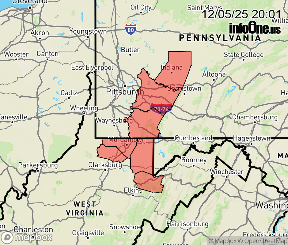 Canceled 12/6/25 8:00 AM Special Weather Statement issued December 5 at 7:59PM EST by NWS Pittsburgh PA Area temperature will fall below freezing and allow for any standing water from melting snow to freeze, which may lead to localized icy spots on roadways. Additional, patchy of freezing fog and drizzle are also possible, especially near the peaks of the higher terrain along the Laurel Highlands of Pennsylvania into the West Virginia higher terrain. This could lead to localized icy spots to develop on elevated surfaces and roadways. Motorists should exercise caution while driving tonight into early Saturday morning before rising temperature and loss of fog ends travel concerns. ![]() |