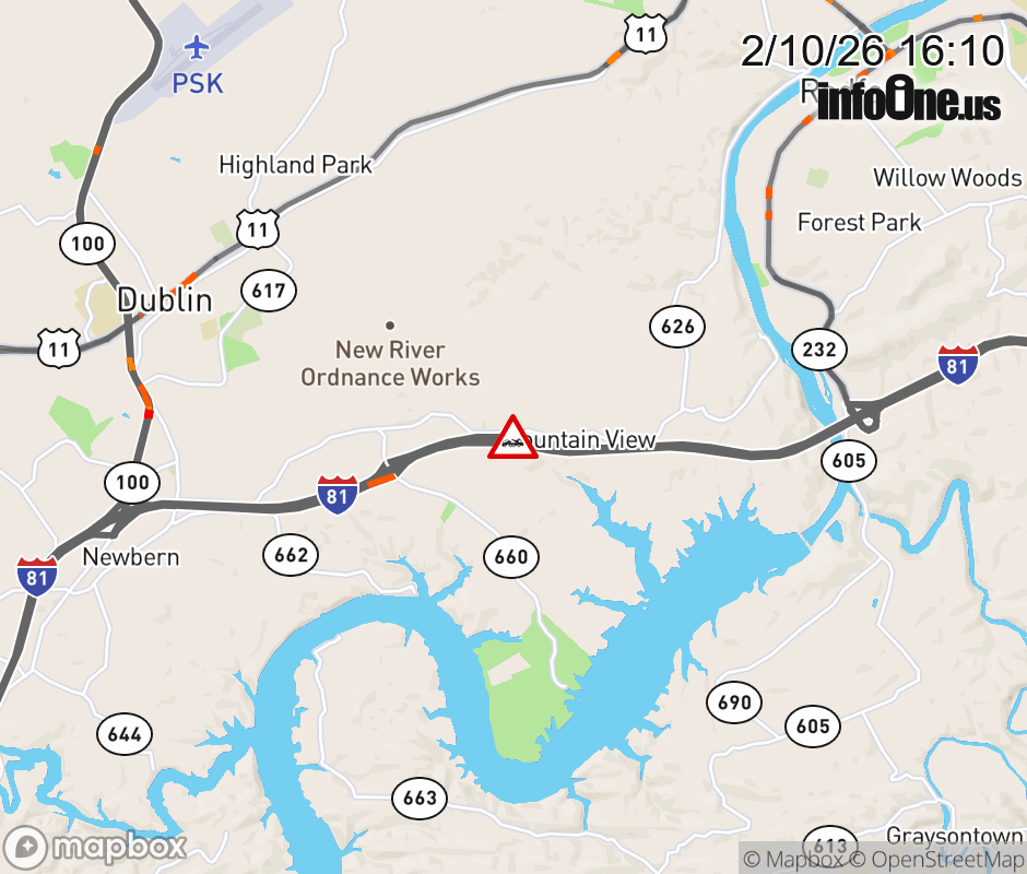On I-81 at mile marker 102.2 in the County of Pulaski, motorists can expect delays due to a disabled vehicle. The south right shoulder is closed. Updated: Tue 2/10/26 4:10 PM EST ![]() Updated: Tue 2/10/26 4:10 PM EST |