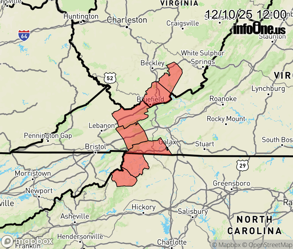 Canceled 12/10/25 7:05 PM Winter Weather Advisory issued December 10 at 11:59AM EST until December 11 at 10:00AM EST by NWS Blacksburg VA * WHAT... Snow expected. Total snow accumulations of 1 to 3 inches. Locally higher amounts at elevations above 4000 feet. Winds gusting as high as 45 mph which may cause blowing snow. * WHERE... Portions of northwest North Carolina, southwest Virginia, and southeast West Virginia... from the High Country of North Carolina northward across Mount Rogers, Tazewell and along the I-77 corridor from Princeton and Bluefield West Virginia north. * WHEN... Until 10 AM EST Thursday. * IMPACTS... Plan on slippery road conditions. The hazardous conditions could impact the Wednesday evening and Thursday morning commutes. Gusty winds could bring down tree branches. * ADDITIONAL DETAILS... The snow may begin as rain. As temperatures fall this evening the rain is expected to change to snow with poor travel conditions expected tonight. ![]() |