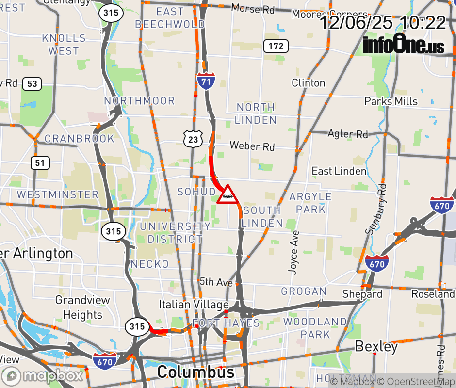 The right shoulder is blocked on I-71 South beyond Hudson St, due to a crash. Updated: Sat 12/6/25 10:22 AM EST ![]() Updated: Sat 12/6/25 10:22 AM EST |