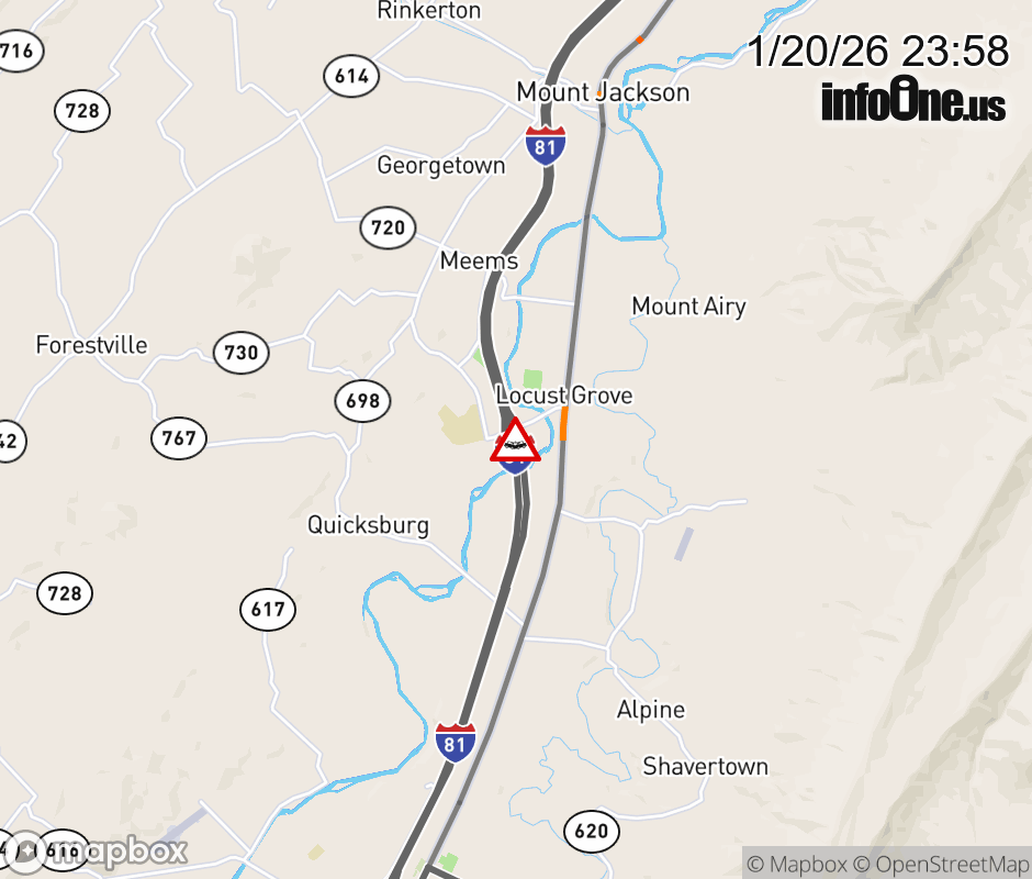 On I-81 at mile marker 269 in the County of Shenandoah, motorists can expect delays due to a vehicle crash. The north left shoulder, left lane, and right lane are closed. Updated: Tue 1/20/26 11:58 PM EST ![]() Updated: Tue 1/20/26 11:58 PM EST |