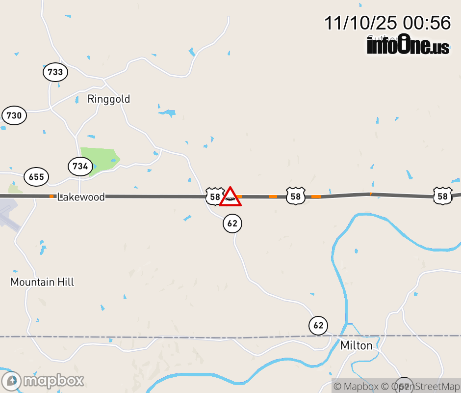 On US-58 West in the County of Pittsylvania, in the vicinity of Ringgold Depot Rd; Rt. 726N/S (Pittsylvania County), motorists can expect delays due to a vehicle crash. Lane closures exist. ![]() |