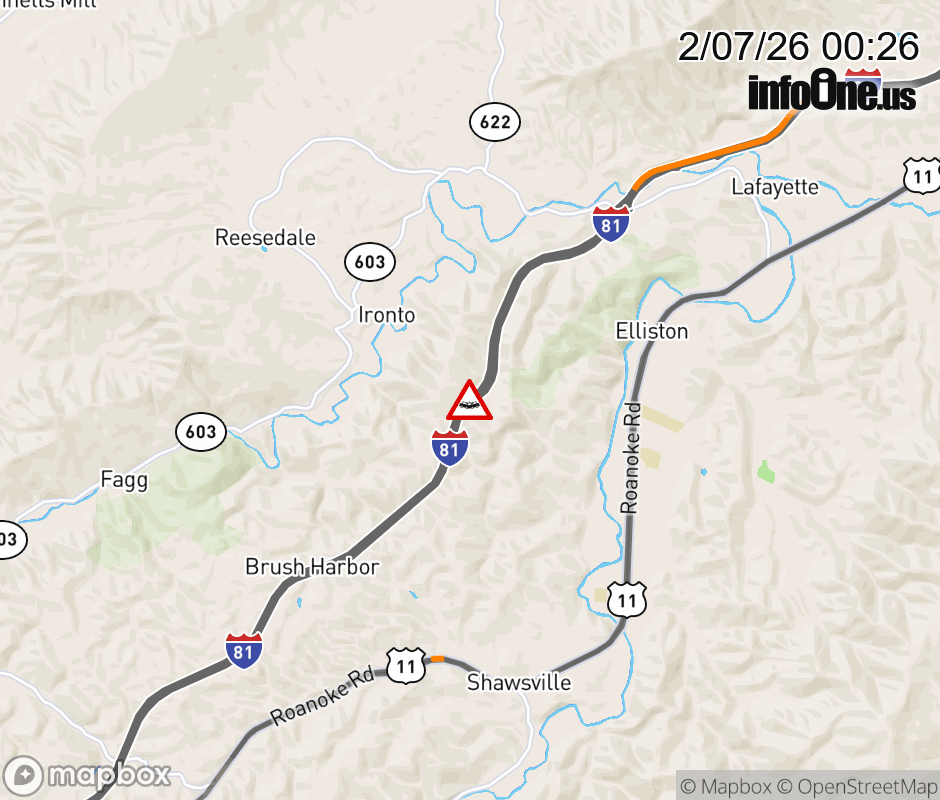 On I-81 at mile marker 125.8 in the County of Montgomery, motorists can expect delays due to a vehicle crash. The south right shoulder is closed. Updated: Sat 2/7/26 12:26 AM EST ![]() Updated: Sat 2/7/26 12:26 AM EST |