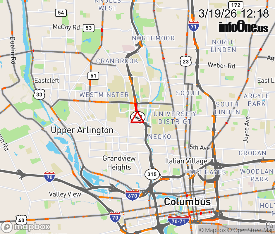 The right shoulder is blocked on SR-315 South at Kinnear Rd/Olentangy Rd, due to debris on roadway. Updated: Thu 3/19/26 12:18 PM EDT ![]() Updated: Thu 3/19/26 12:18 PM EDT |