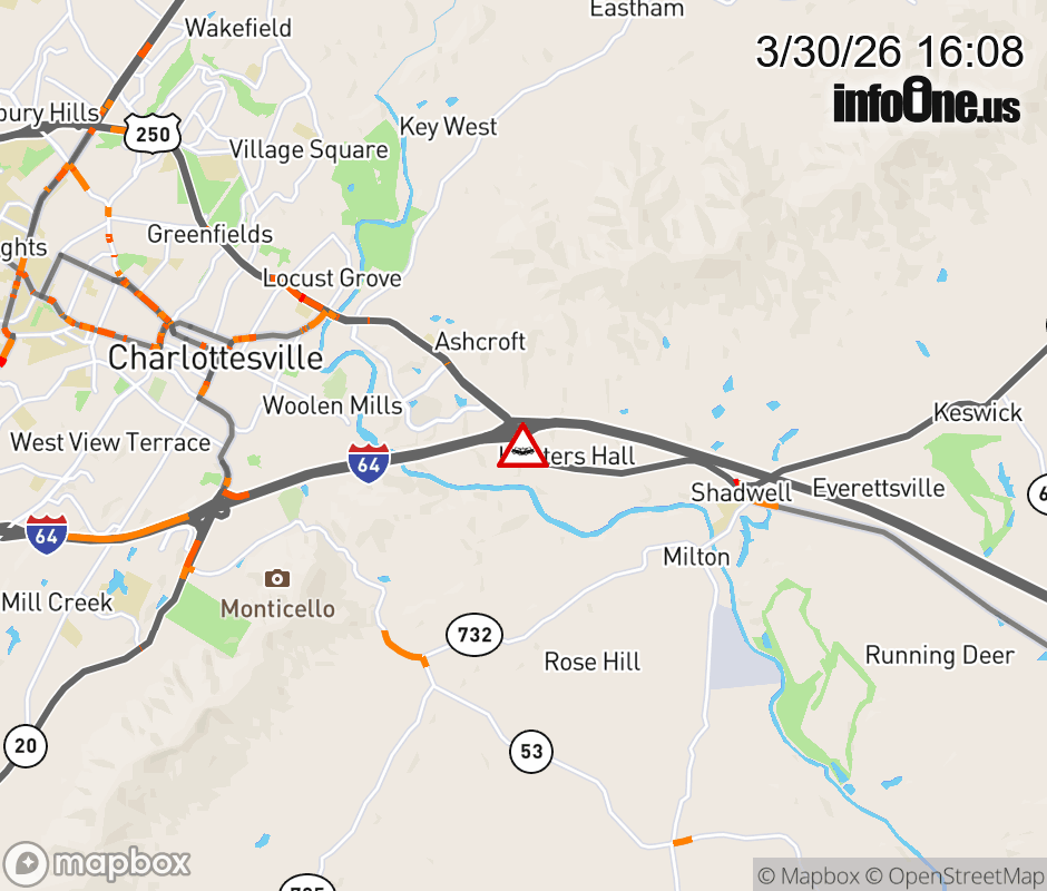 On US-250 in the County of Albemarle, in the vicinity of Crossover; South Lego Farm; Rt. 1107N/S (Albemarle County), motorists can expect delays due to a vehicle crash. The east right shoulder is closed. ![]() |