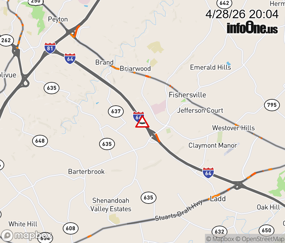 On I-64 West at mile marker 91 in the County of Augusta, motorists can expect delays due to a vehicle crash. Updated: Tue 4/28/26 8:04 PM EDT ![]() Updated: Tue 4/28/26 8:04 PM EDT |