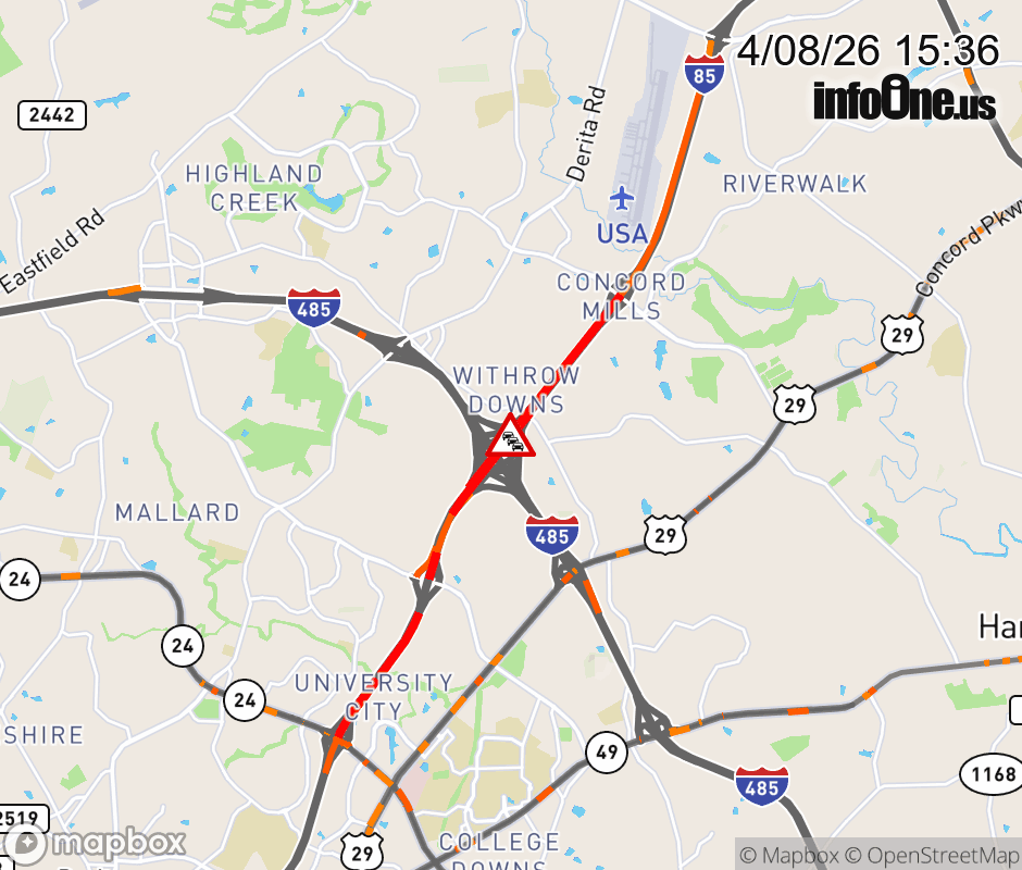 The left lane is closed past Exit 48 (I-485). Updated: Wed 4/8/26 3:36 PM EDT ![]() Updated: Wed 4/8/26 3:36 PM EDT |