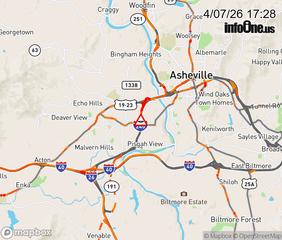 The right shoulder closed at Exit 2, US 19/23 Business, (Haywood Road). Updated: Tue 4/7/26 5:28 PM EDT ![]() Updated: Tue 4/7/26 5:28 PM EDT |