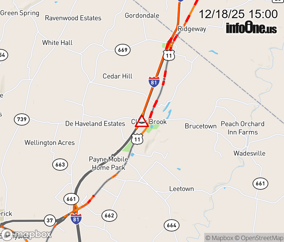 On Rt. 672 in the County of Frederick, in the vicinity of the ramp from and to I-81N, motorists can expect delays due to a vehicle crash. All east lanes are closed. All west lanes are closed. Updated: Thu 12/18/25 3:00 PM EST ![]() |