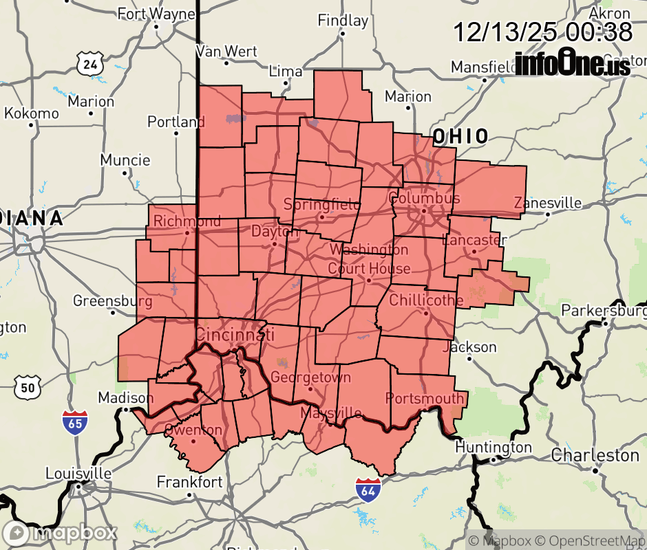 Canceled 12/13/25 2:19 AM Cold Weather Advisory issued December 13 at 12:36AM EST until December 15 at 11:00AM EST by NWS Wilmington OH * WHAT... Very cold wind chills as low as 10 to 15 below zero. * WHERE... Portions of east central and southeast Indiana, northeast and northern Kentucky, and central, south central, southwest, and west central Ohio. * WHEN... From 7 PM this evening to 11 AM EST Monday. * IMPACTS... The cold wind chills as low as 15 below zero could result in hypothermia or frostbite if precautions are not taken. ![]() |