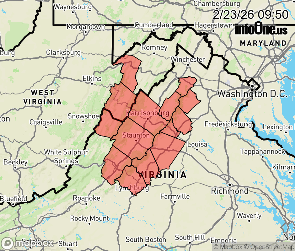 Canceled 2/23/26 12:40 PM Wind Advisory issued February 23 at 9:49AM EST until February 23 at 3:00PM EST by NWS Baltimore MD/Washington DC * WHAT... Northwest winds 15 to 25 mph with gusts up to 50 mph. * WHERE... In Virginia, Central Virginia Blue Ridge and Northern Virginia Blue Ridge, and Western Highland County. In West Virginia, Western Grant and Western Pendleton Counties. * WHEN... Until 3 PM EST this afternoon. * IMPACTS... Gusty winds will blow around unsecured objects. Tree limbs could be blown down and a few power outages may result. * ADDITIONAL DETAILS... Expect wind chills to fall into the single digits this afternoon to below zero at elevations above 3000 feet. ![]() |