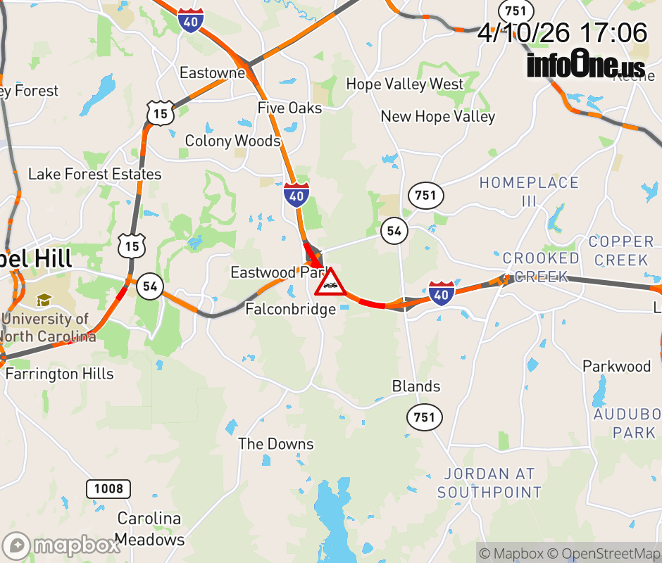 The right shoulder is closed at Exit 273 (NC 54). Updated: Fri 4/10/26 5:06 PM EDT ![]() Updated: Fri 4/10/26 5:06 PM EDT |