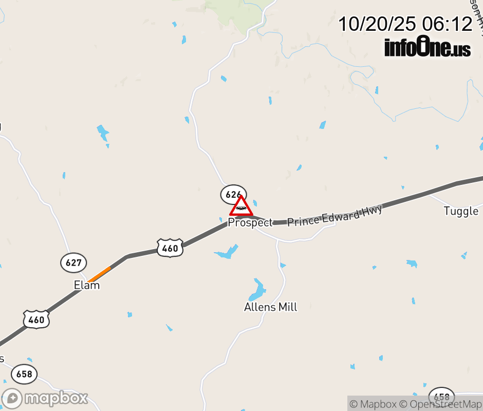 On Rt. 626 North in the County of Prince Edward, in the vicinity of Prince Edward Hwy; US-460W, motorists can expect delays due to a vehicle crash. Lane closures exist. ![]() |