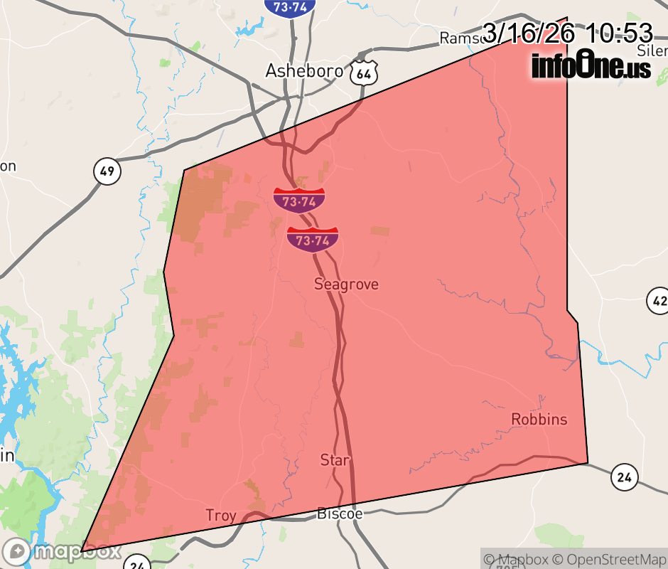 Canceled 3/16/26 10:58 AM Tornado Warning issued March 16 at 10:52AM EDT until March 16 at 11:00AM EDT by NWS Raleigh NC At 1052 AM EDT, a severe thunderstorm capable of producing a tornado was located near Seagrove, or 9 miles southwest of North Carolina Zoo, moving northeast at 50 mph. HAZARD...Tornado. SOURCE...Radar indicated rotation. IMPACT...Flying debris will be dangerous to those caught without shelter. Mobile homes will be damaged or destroyed. Damage to roofs, windows, and vehicles will occur. Tree damage is likely. This dangerous storm will be near... North Carolina Zoo and Seagrove around 1055 AM EDT. Other locations impacted by this tornadic thunderstorm include Coleridge, Steeds, Star, Robbins, and Ulah. This includes Interstate 73 between Mile Markers 50 and 70. ![]() |