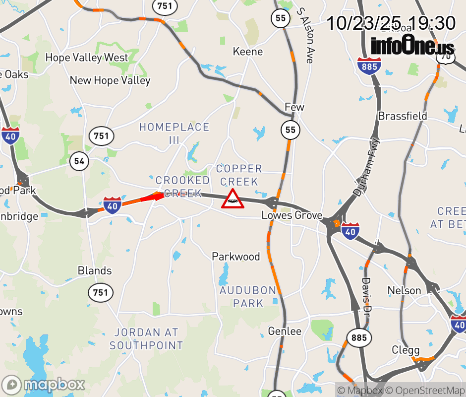 The left lane is closed before Exit 278 (NC 55). Updated: Thu 10/23/25 7:30 PM EDT ![]() Updated: Thu 10/23/25 7:30 PM EDT |