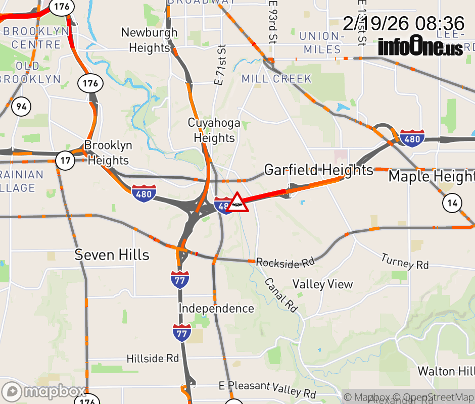 The 2 right lanes are blocked on I-480 West beyond Transportation Blvd/E 98th St, due to a crash. Updated: Thu 2/19/26 8:36 AM EST ![]() Updated: Thu 2/19/26 8:36 AM EST |