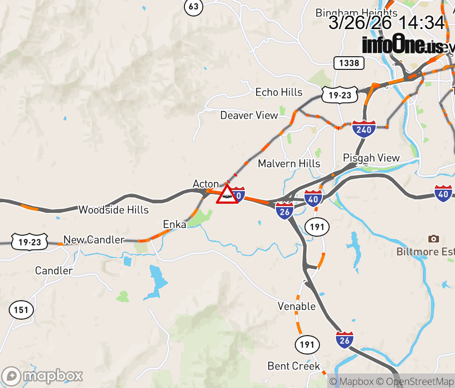 The right shoulder is closed at Exit 44, US 19/23/74 ALT (Smokey Park Highway). Updated: Thu 3/26/26 2:34 PM EDT ![]() Updated: Thu 3/26/26 2:34 PM EDT |