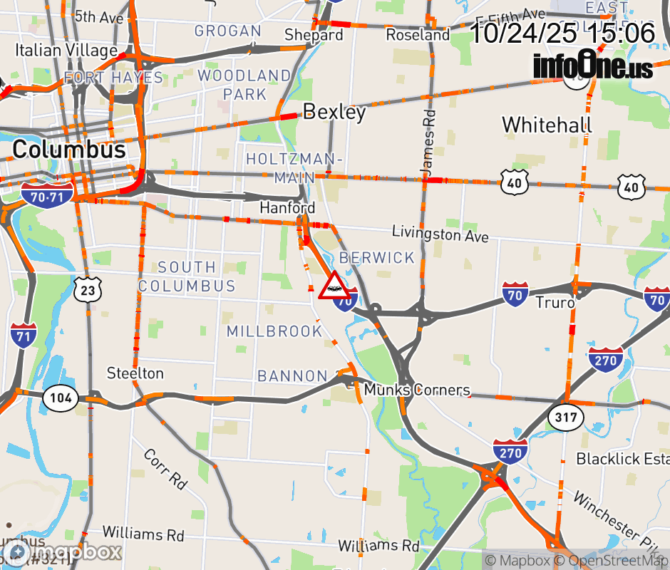 The right shoulder is blocked on I-70 East beyond Alum Creek Dr/Livingston Ave, due to a crash. Updated: Fri 10/24/25 3:06 PM EDT ![]() Updated: Fri 10/24/25 3:06 PM EDT |
