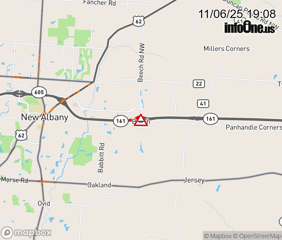 The left shoulder is blocked on SR-161 East beyond Beech Rd, due to a crash. Updated: Thu 11/6/25 7:08 PM EST ![]() Updated: Thu 11/6/25 7:08 PM EST |