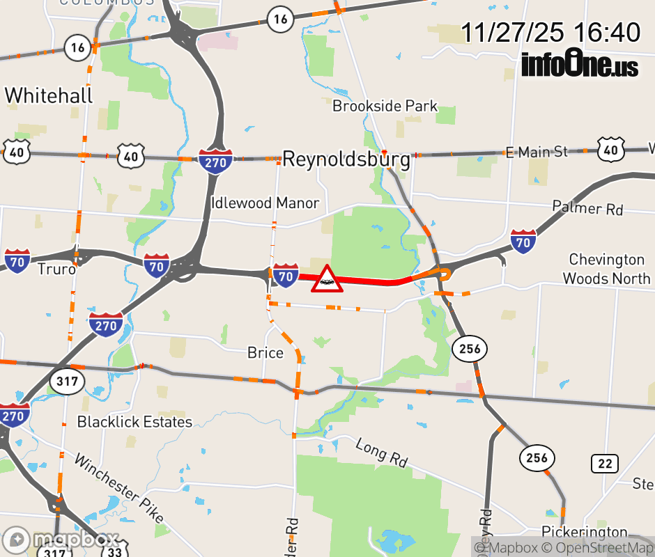 The right lane is blocked on I-70 West beyond SR-256, due to a crash. Updated: Thu 11/27/25 4:40 PM EST ![]() Updated: Thu 11/27/25 4:40 PM EST |