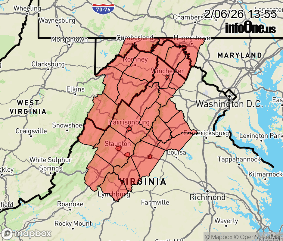 Canceled 2/6/26 8:00 PM Special Weather Statement issued February 6 at 1:54PM EST by NWS Baltimore MD/Washington DC * WHAT... Light snow likely. Total snow accumulations up to 1 inch, with locally higher amounts of 1 to 2 inches possible along the ridges. * WHERE... Shenandoah Valley of Virginia, eastern West Virginia, western Maryland and central Virginia. * WHEN... Through 6 PM this evening. * IMPACTS... Plan on slippery road conditions this afternoon and evening. ![]() |