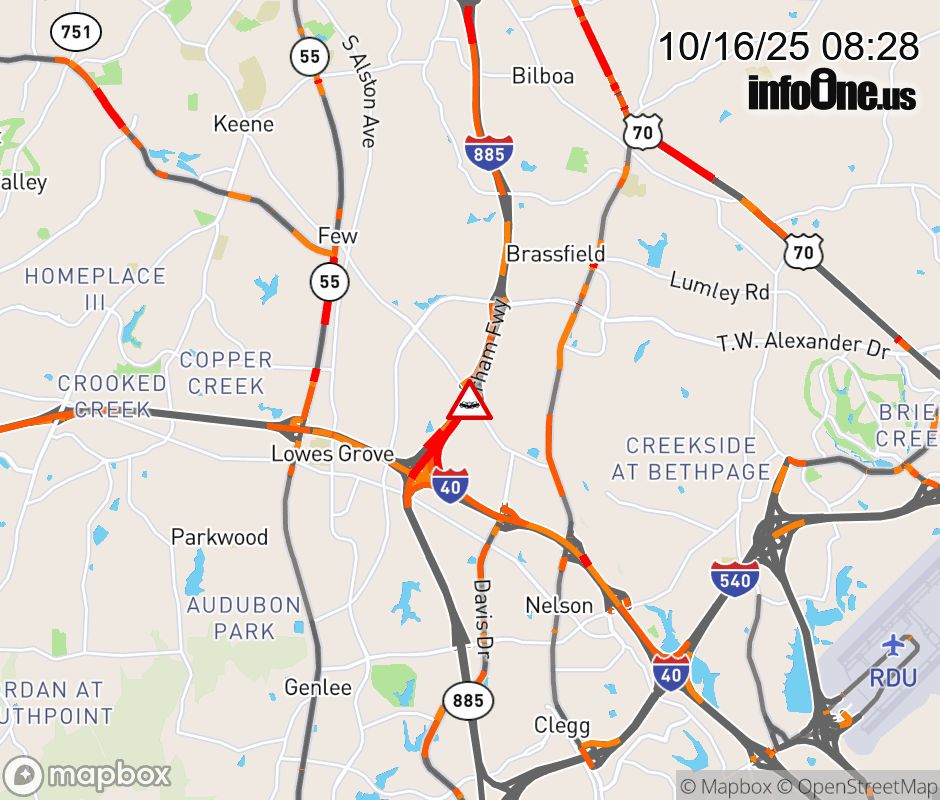 The right shoulder is closed at Exit 6 (E Cornwallis Rd). Updated: Thu 10/16/25 8:28 AM EDT ![]() Updated: Thu 10/16/25 8:28 AM EDT |