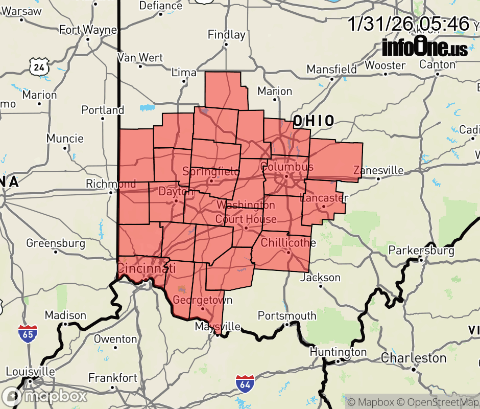 Canceled 1/31/26 10:03 AM Cold Weather Advisory issued January 31 at 5:45AM EST until February 1 at 10:00AM EST by NWS Wilmington OH * WHAT... For the Extreme Cold Warning, dangerously cold wind chills as low as 20 below zero. For the Cold Weather Advisory, very cold wind chills as low as 14 below zero expected. * WHERE... Portions of central, south central, southwest, and west central Ohio. * WHEN... For the Extreme Cold Warning, until noon EST today. For the Cold Weather Advisory, from 10 PM this evening to 10 AM EST Sunday. * IMPACTS... The dangerously cold wind chills as low as 20 below zero could cause frostbite on exposed skin in as little as 30 minutes. An extended period of freezing temperatures could cause ruptured water pipes. ![]() |