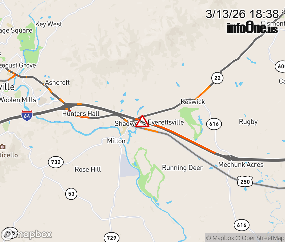 On I-64 West at mile marker 126.9 in the County of Albemarle, motorists can expect delays due to a vehicle fire. Traffic backups are approximately 2.0 miles.