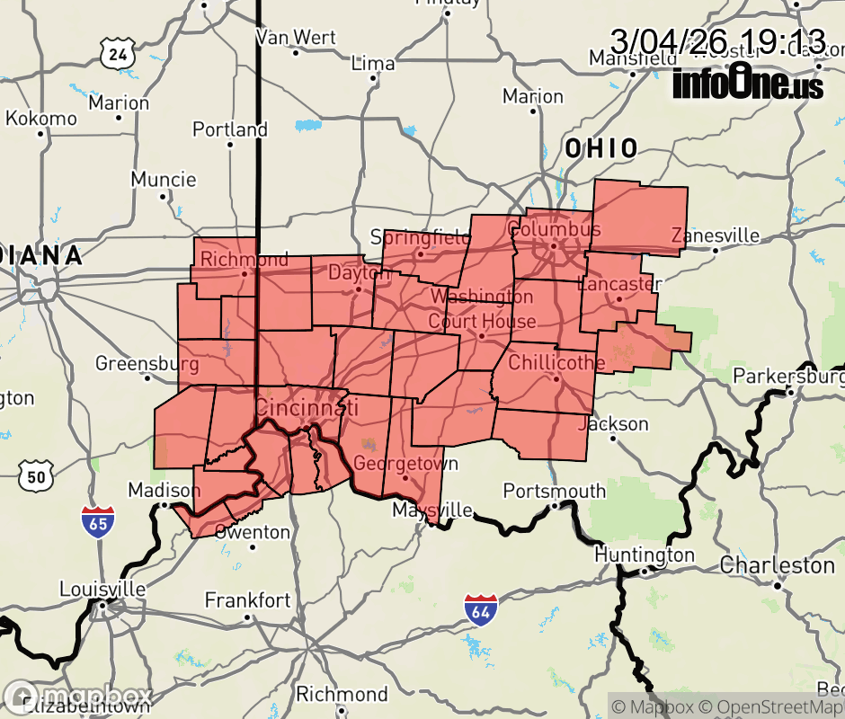 Canceled 3/5/26 4:53 AM Flood Watch issued March 4 at 7:11PM EST until March 5 at 1:00PM EST by NWS Wilmington OH * WHAT... Flooding caused by excessive rainfall continues to be possible. * WHERE... The following counties, in Indiana, Dearborn, Fayette, Franklin, Ohio, Ripley, Switzerland, Union and Wayne, the following counties, in northern Kentucky, Boone, Campbell, Carroll, Gallatin and Kenton, and the following counties, in Ohio, Brown, Butler, Clark, Clermont, Clinton, Fairfield, Fayette, Franklin, Greene, Hamilton, Highland, Hocking, Licking, Madison, Montgomery, Pickaway, Pike, Preble, Ross and Warren. * WHEN... Through Thursday afternoon. * IMPACTS... Soils remain moist and excessive runoff may result in flooding of rivers, creeks, streams, and other low-lying and flood-prone locations. * ADDITIONAL DETAILS... - Showers and some thunderstorms will move across the region through Thursday morning. Rainfall of 1 to 2 inches is expected, with local amounts up to 3 inches possible. ![]() |