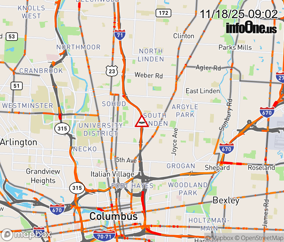 The 2 left lanes are blocked on I-71 North beyond 17th Ave, due to a crash. Updated: Tue 11/18/25 9:02 AM EST ![]() Updated: Tue 11/18/25 9:02 AM EST |