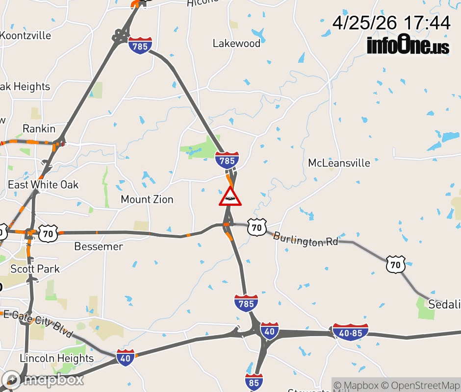 The left shoulder is closed after Exit 17 (Huffine Mill Rd). Updated: Sat 4/25/26 5:44 PM EDT ![]() Updated: Sat 4/25/26 5:44 PM EDT |