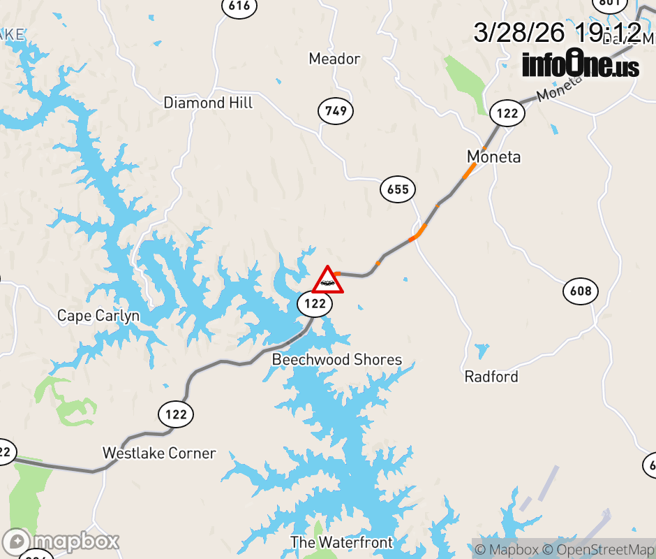 On VA-122 in the County of Bedford, in the vicinity of Campers Paradise Trl, motorists can expect delays due to a vehicle crash. All north lanes are closed. ![]() |